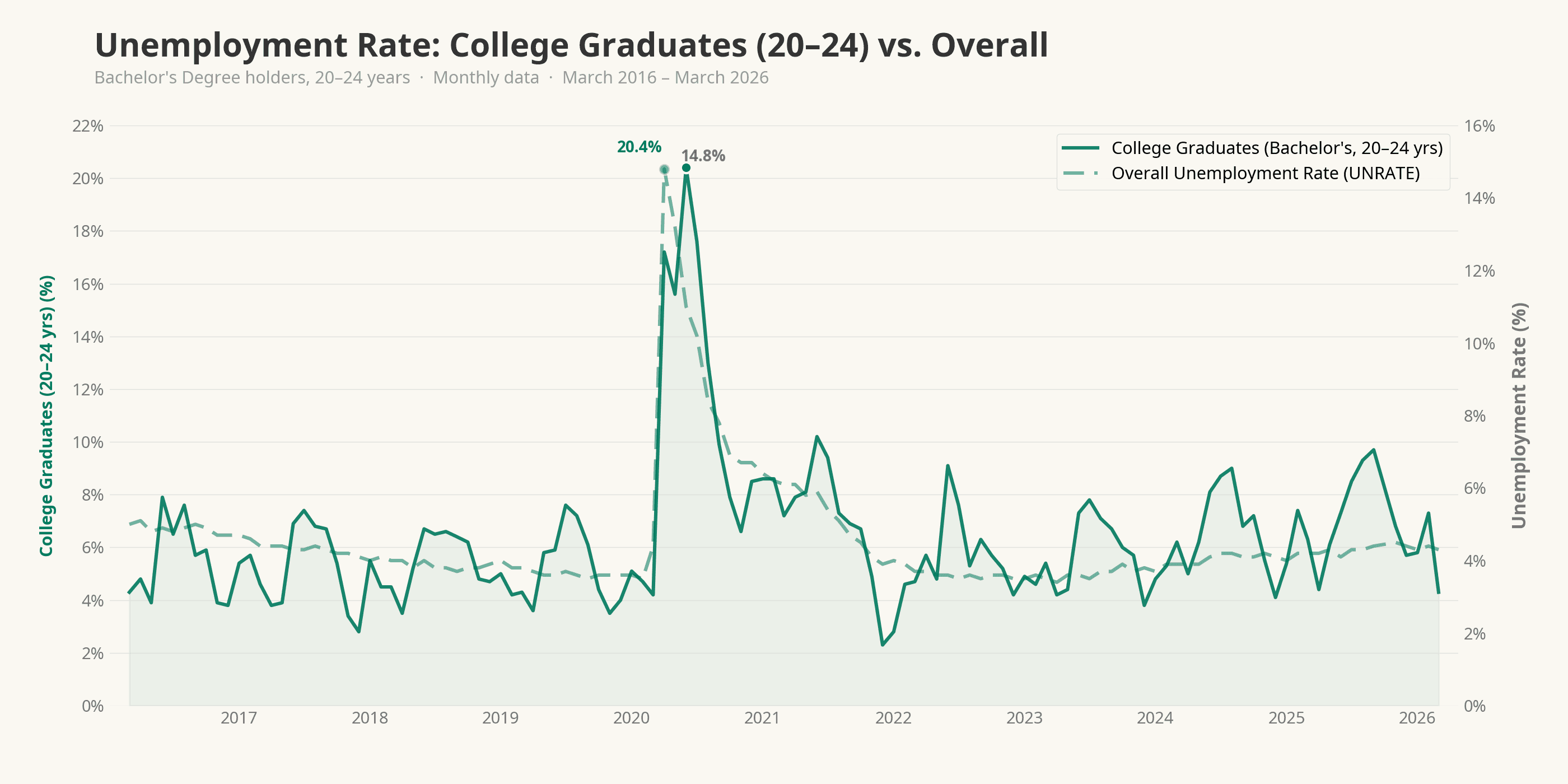 Even before these twin shocks took hold, Fed Chair Jerome Powell observed at the August 2025 Jackson Hole Symposium that the labor market was exhibiting unusual fragility: payroll growth had stalled and job gains were narrowing sharply. Monthly payroll growth had slowed to an average of just 35,000 jobs (down from 168,000 per month in 2024) and the unemployment rate for recent college graduates had climbed to 4.8%, above the national average for the first time in decades. With 92,000 jobs lost this February and growth already concentrated in just a few sectors, the labor market was poorly positioned to absorb the disruptions now arriving from two directions at once.