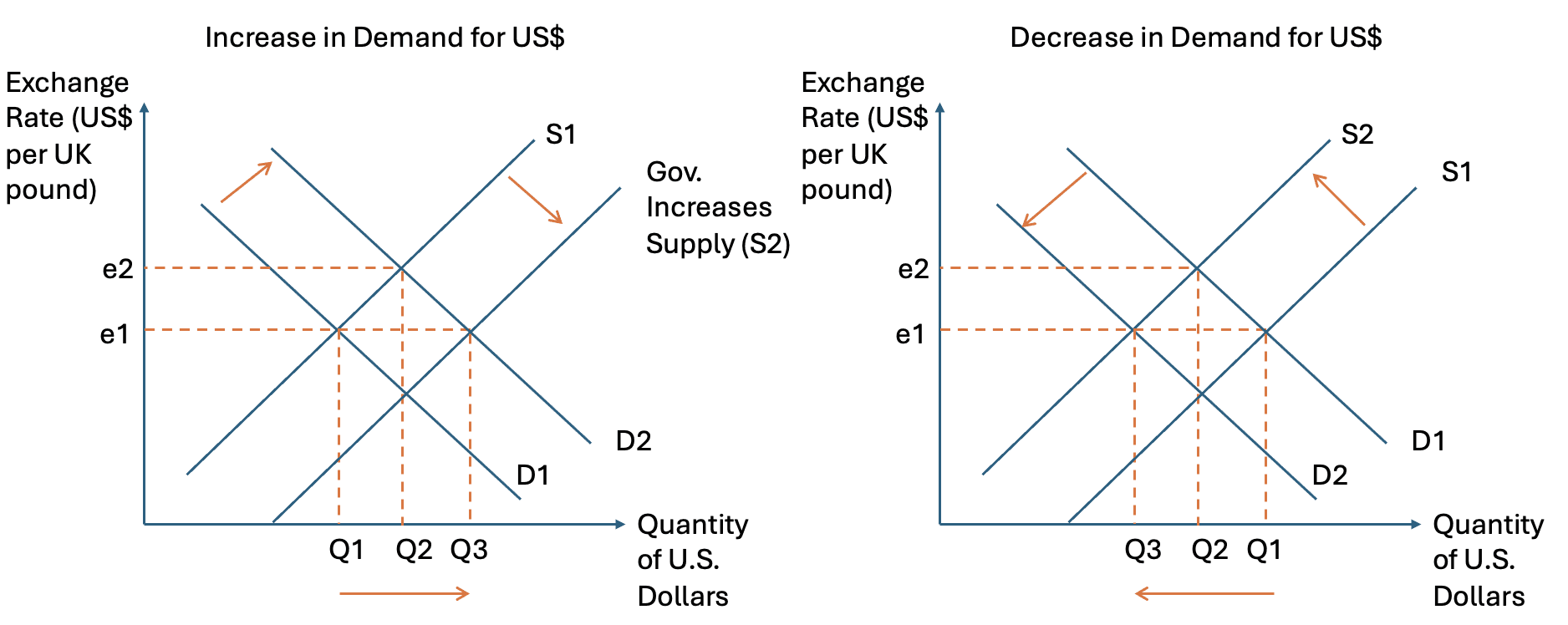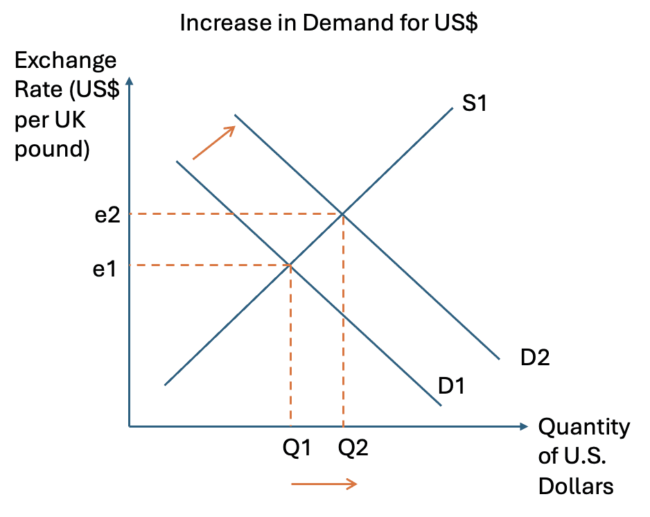 The trade balance also matters. An increase in exports raises demand for dollars, while an increase in imports raises the supply of dollars. Changes in net exports therefore influence the exchange rate.
