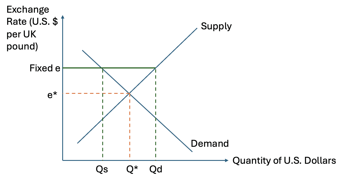 In a fixed exchange rate system, the authorities must intervene in the foreign exchange market to maintain the chosen rate. If the demand for dollars exceeds the supply at the fixed rate, upward pressure will arise that would normally cause the dollar to appreciate. To prevent this, the authorities must supply additional dollars, often by purchasing foreign currency assets. If the supply of dollars exceeds demand, downward pressure will arise that would normally cause the dollar to depreciate. In this case, the authorities must buy dollars using foreign exchange reserves.