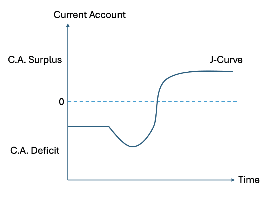 This time path of adjustment is known as the J curve effect. The current account initially moves further into deficit after a depreciation, before gradually improving as quantities respond to the new relative prices. Time is measured on the horizontal axis, and the current account balance on the vertical axis. The curve traces a path that resembles the letter J, first dipping downwards before rising above its initial level as the effects of increased export volumes and reduced import volumes take hold.