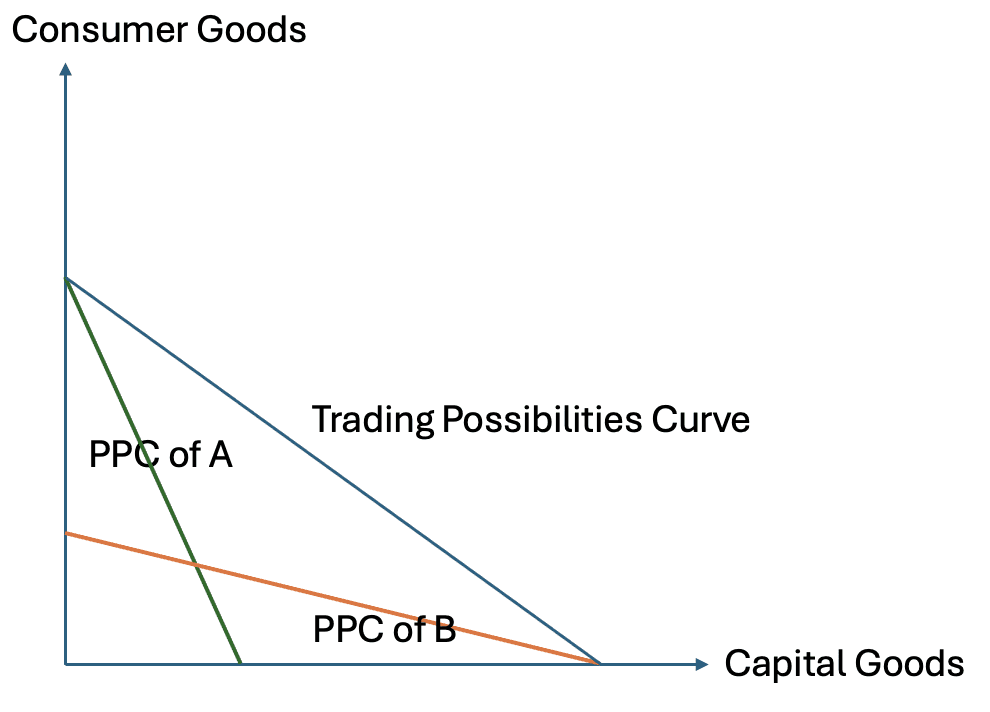 This logic can be illustrated using production possibility curves. Each country’s production possibility curve shows the combinations of goods that can be produced given current resources and technology. The slope of the curve reflects opportunity costs. Differences in these slopes indicate differences in comparative advantage. When countries specialize according to these differences and trade, their consumption possibilities expand beyond their individual production possibility curves.