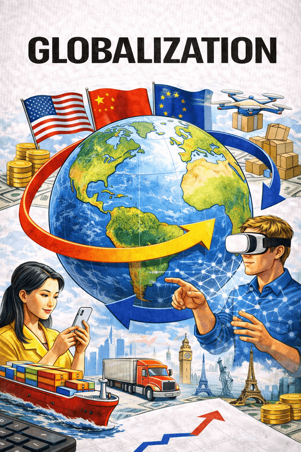 Globalization refers to the process through which the world’s economies have become increasingly integrated. This integration occurs as a result of technological change, policy decisions, and the expansion of markets across national boundaries. As economies become more closely connected, events in one part of the world have stronger and more immediate effects on economic activity elsewhere. Production, trade, finance, information, and labor markets are no longer confined within national borders to the extent they once were.