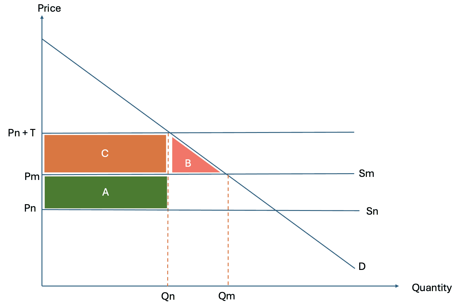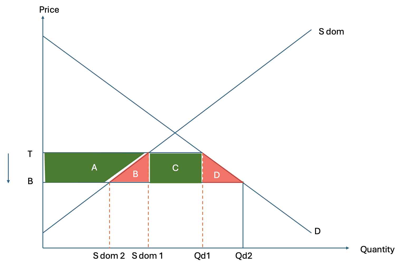 When a tariff is imposed, the domestic price rises by the amount of the tariff. This higher price reduces quantity demanded and increases quantity supplied by domestic producers. As a result, imports fall. The tariff therefore achieves two immediate objectives. It reduces reliance on imports and encourages domestic production.