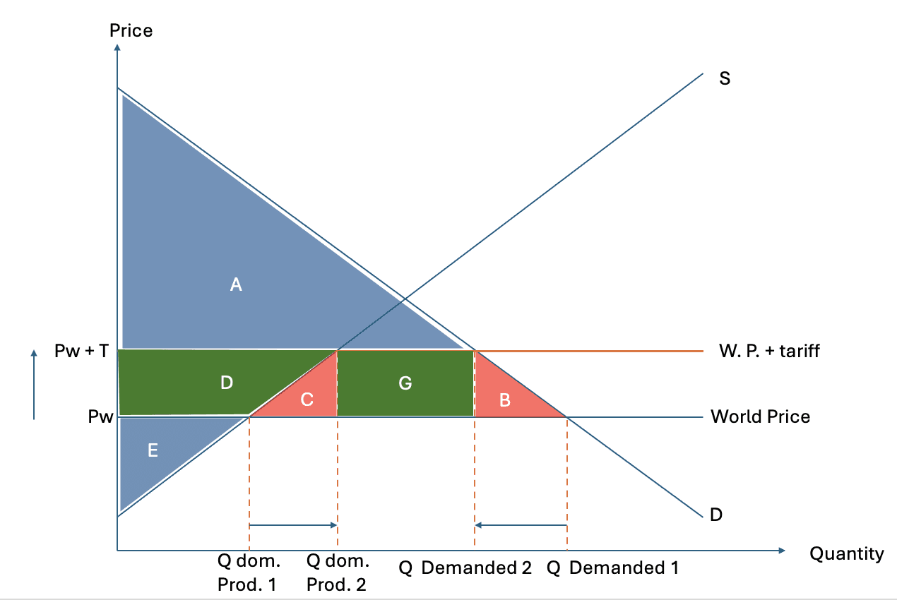 The diagram shows how a tariff redistributes and reduces welfare. Area D is the gain in producer surplus from the higher price, while area G is tariff revenue received by the government. Areas B and C represent deadweight welfare losses, with B showing the reduction in consumption and C showing inefficient expansion of higher-cost domestic production. Area A shows the new consumer surplus from the price increase, while area E shows the original producer surplus at the world price before the tariff. Overall, the loss to consumers exceeds the gains to producers and government, so total welfare falls.