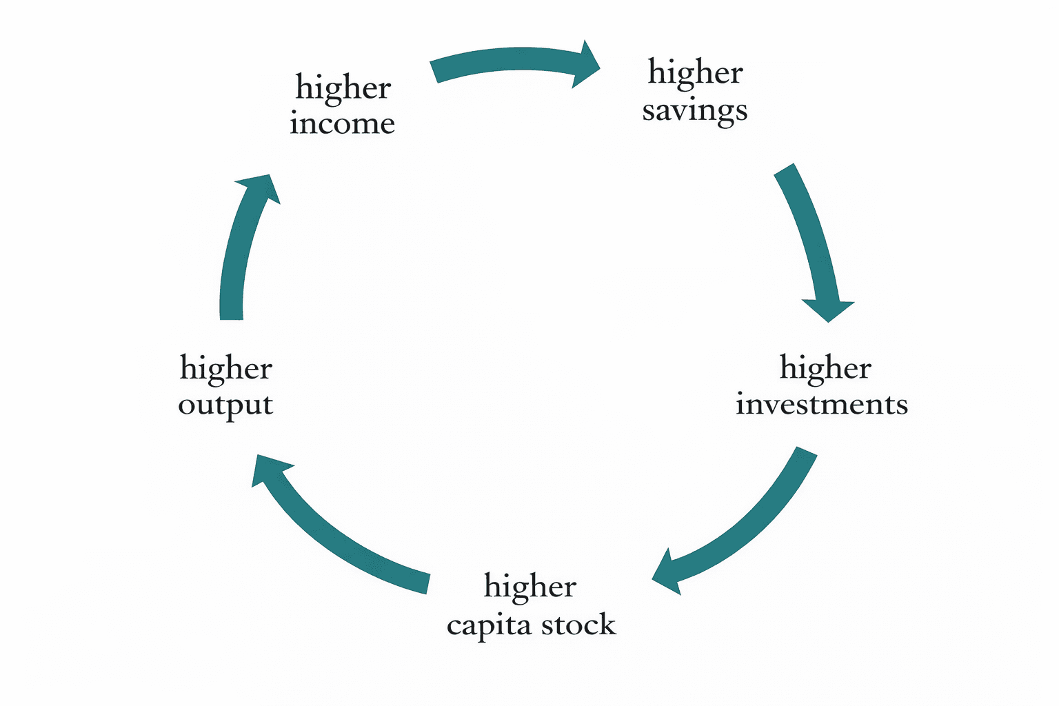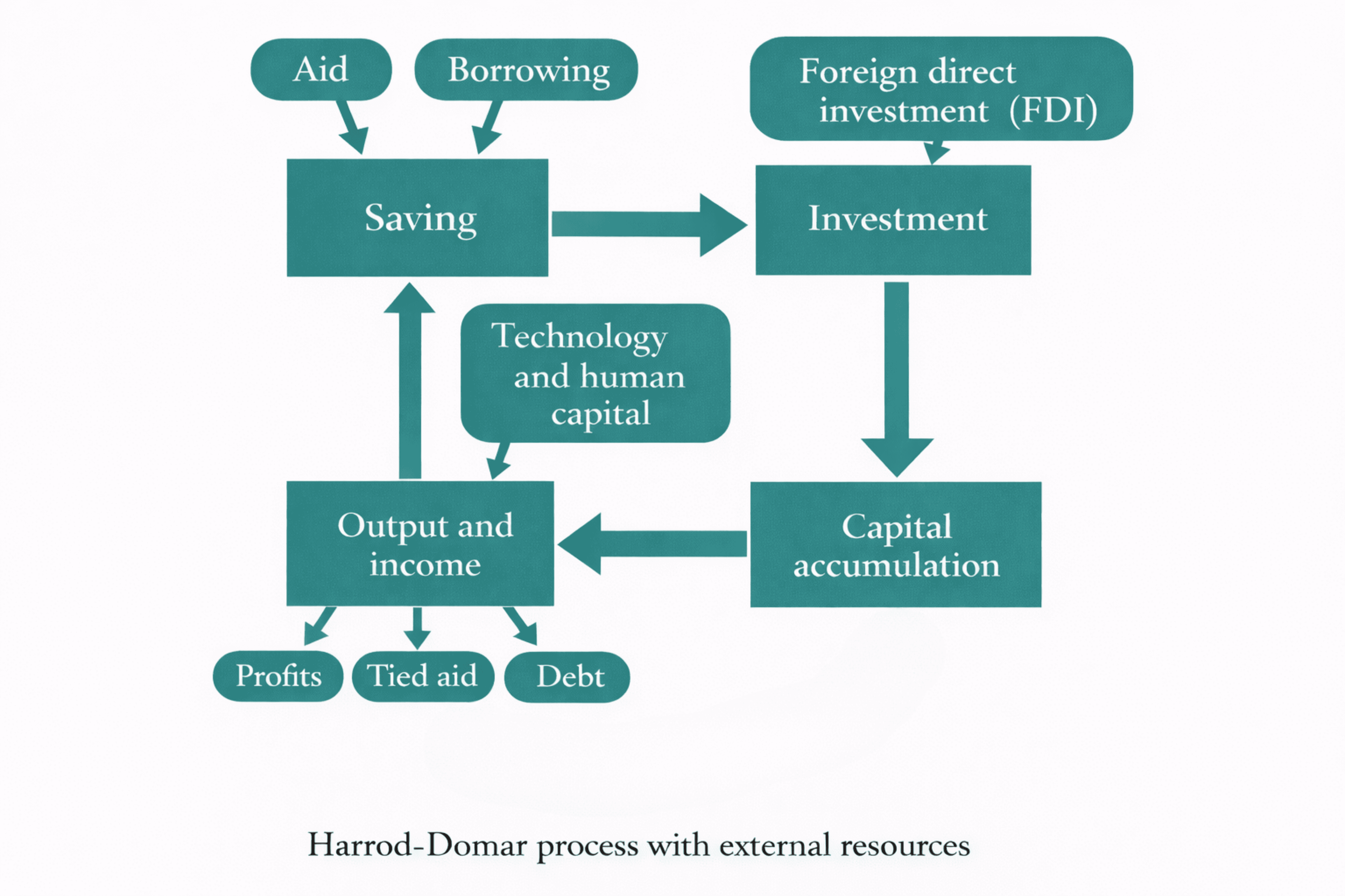 In the context of developing economies, the Harrod–Domar model highlights the central role of capital accumulation. Investment increases the stock of capital, which raises productive capacity and output. Higher output leads to higher incomes, which can then support higher saving. In this way, growth can become self-sustaining once the initial constraints on saving and investment are overcome.