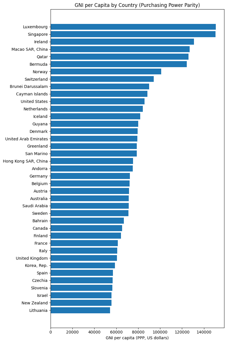GNI per capita measured using PPP therefore provides an estimate of how much people can consume in their own countries, adjusted for differences in price levels. This approach often narrows the apparent gap between high-income and low-income countries compared with US dollar measures.