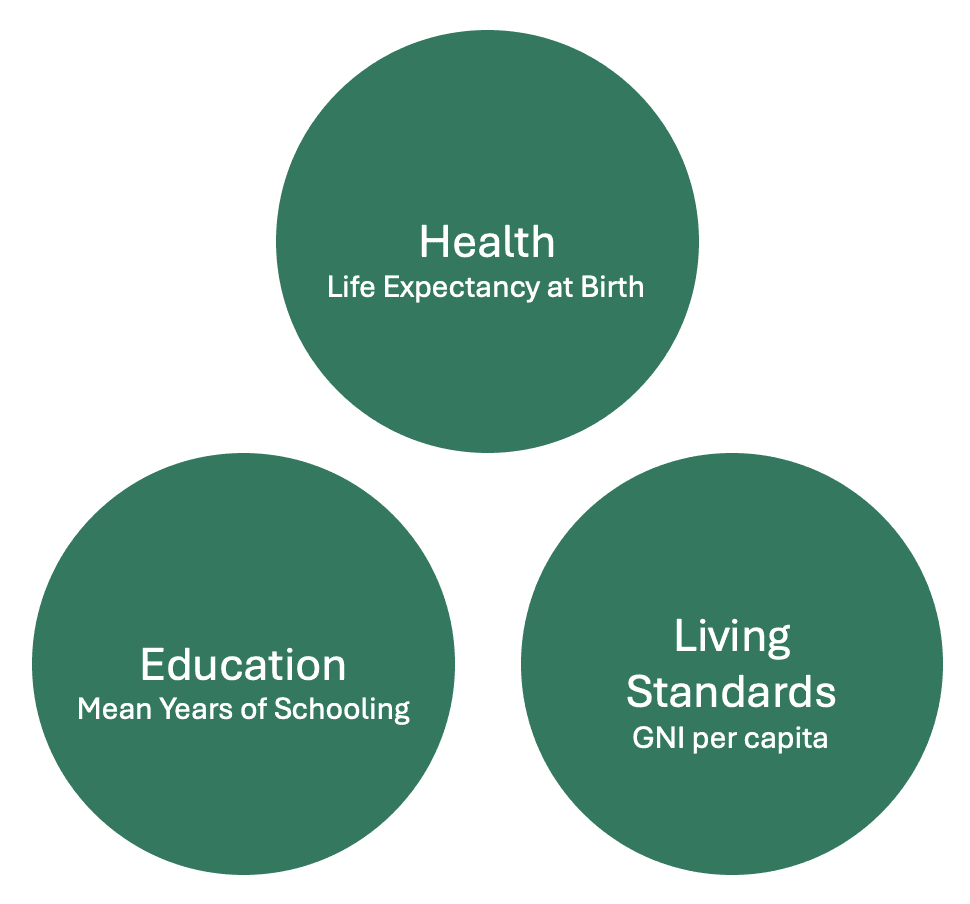 Each of these indicators is normalised to produce an index value between zero and one. Higher values indicate better outcomes. The three indices are then combined to produce the HDI, which also ranges between zero and one. Countries with higher HDI values are regarded as having achieved higher levels of human development.