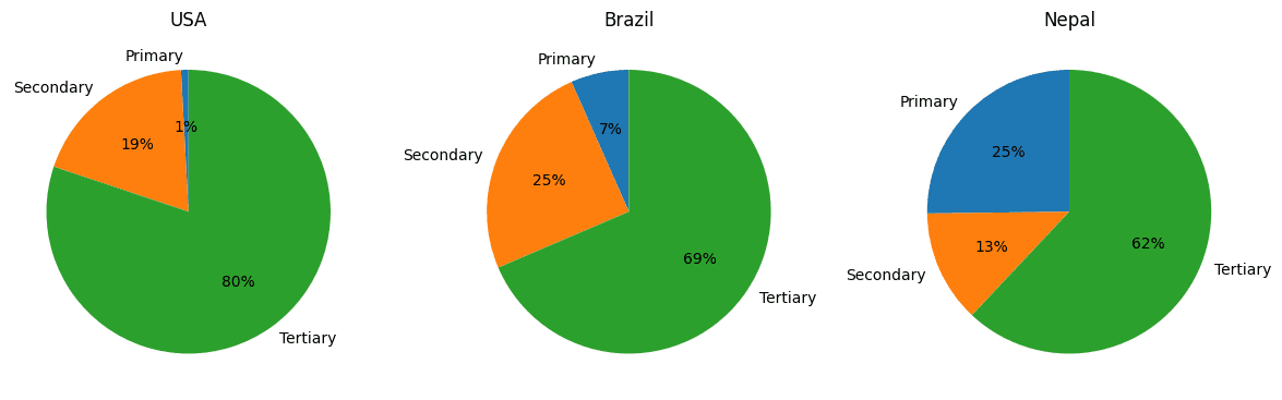 This contrast can be illustrated by comparing economies such as Brazil, Nepal, and the United States. In an economy like the USA, agriculture contributes a very small percentage of GDP, while services account for the majority of economic activity. Manufacturing remains significant but no longer dominates. In Ethiopia, agriculture contributes a much larger share of GDP, and manufacturing plays a relatively limited role.