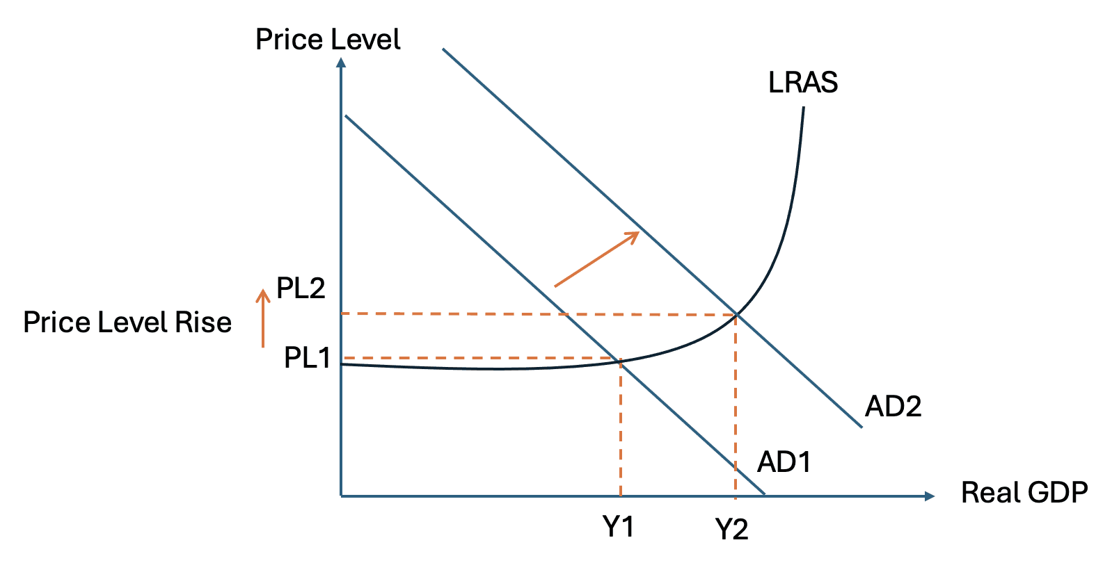 Unlike cost-push inflation, demand-pull inflation does not involve a fall in output. Instead, it reflects upward pressure on prices as the economy operates at or near full capacity. This difference is important for policy. Demand-pull inflation can often be addressed by policies that reduce aggregate demand, such as tighter monetary policy or contractionary fiscal policy. By reducing spending growth, policymakers can ease inflationary pressure without necessarily causing a sharp fall in output if action is taken early.