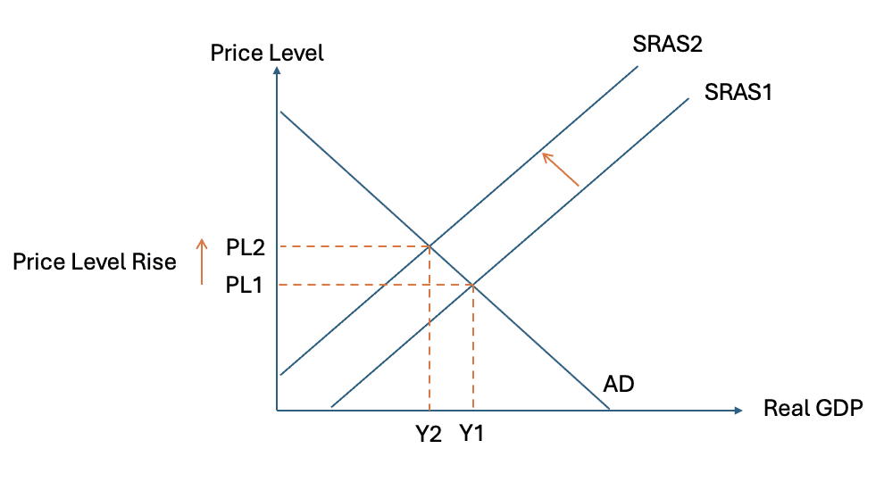 When production costs rise, firms are willing to supply less output at each price level. This causes the short-run aggregate supply curve to shift to the left. At the original level of aggregate demand, the new intersection occurs at a higher price level and a lower level of real output. The result is inflation combined with a fall in output, a situation often described as stagflation.